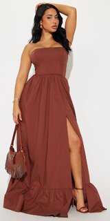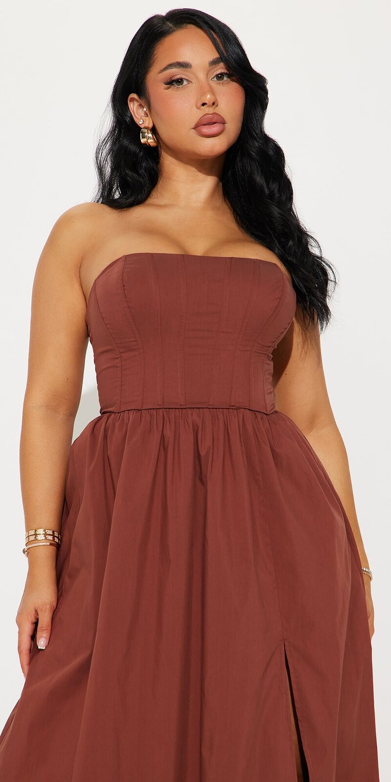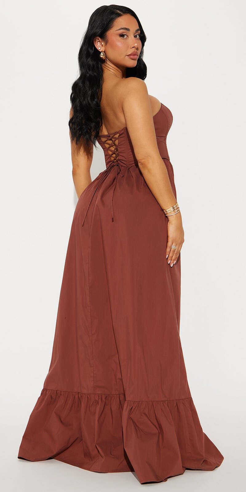Luxusné hnedé maxi šaty bez ramienok s korzetovým pásom a viazaním na chrbte pôsobia mimoriadne žensky a elegantne. Popelinová tkanina drží tvar a dodáva šatám noblesný objem.