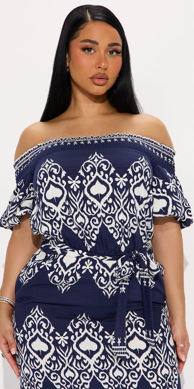 Elegantné maxi šaty v modrej farbe pôsobia uvoľnene a zároveň žensky vďaka odhaleným ramenám a splývavej siluete. Jemný, hladký materiál s mäkkým povrchom je príjemný na dotyk, krásne splýva a zaručuje komfort aj pri celodennom nosení.