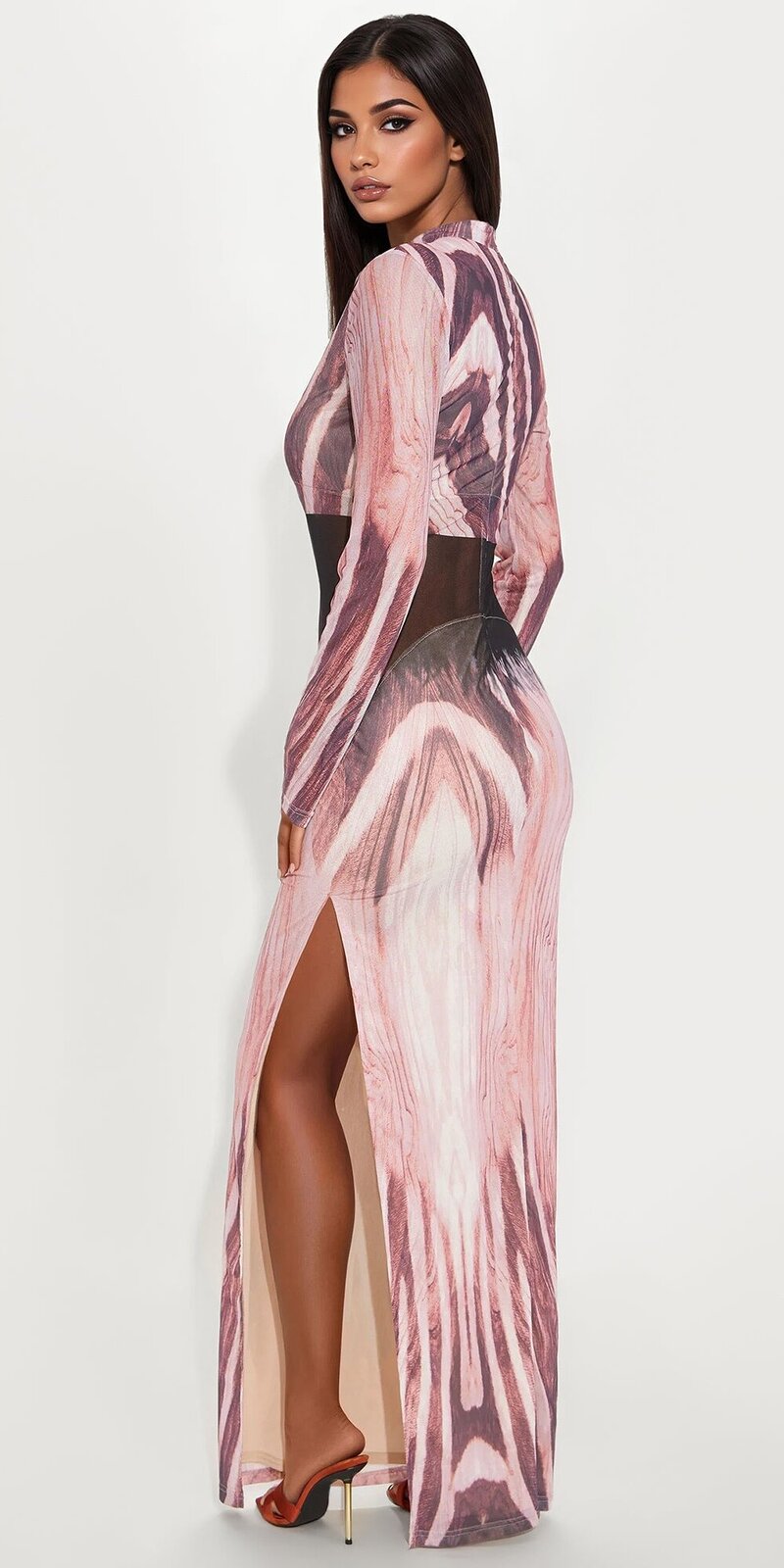 Výrazné maxi šaty v ružovej farbe pôsobia luxusne a zmyselne vďaka jemne priehľadnému sieťovanému povrchu a rafinovaným detailom. Pružný materiál je ľahký, hladký a príjemný na dotyk, zatiaľ čo podšívka zabezpečuje komfort a elegantný vzhľad.