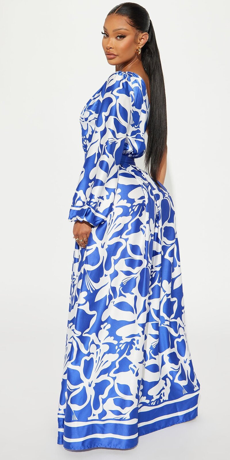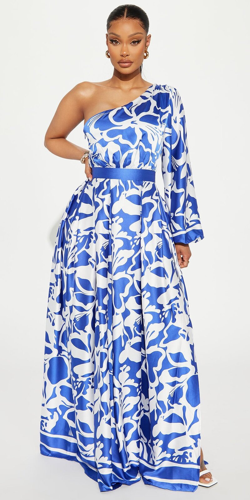 Tieto modré saténové maxi šaty na jedno rameno sú synonymom pôvabu a sofistikovanosti. Jemne lesklý satén pôsobí elegantne, zatiaľ čo balónový rukáv a plisovaná sukňa dodávajú modelu dynamiku a ľahkosť. Vysoký bočný rozparok zaisťuje ladný pohyb pri chôdzi a decentne odhaľuje nohy.