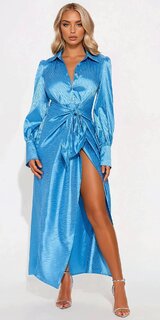 Saténové maxi šaty košeľového strihu s viazaním v modrej farbe Zväčšiť