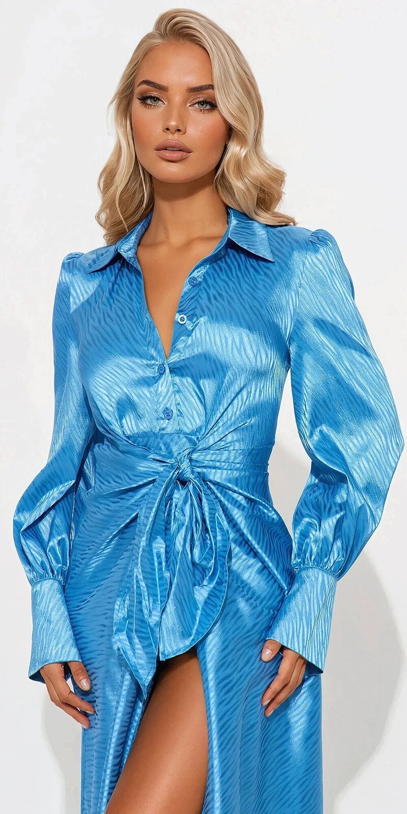 Luxusné maxi šaty v modrej farbe s jemne lesklým saténovým povrchom, ktorý pôsobí hladko, elegantne a príjemne na dotyk. Košeľový strih s golierom, gombíkovým zapínaním a viazaním v páse vytvára sofistikovanú siluetu s módnym nádychom.
