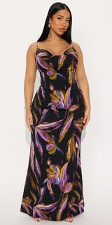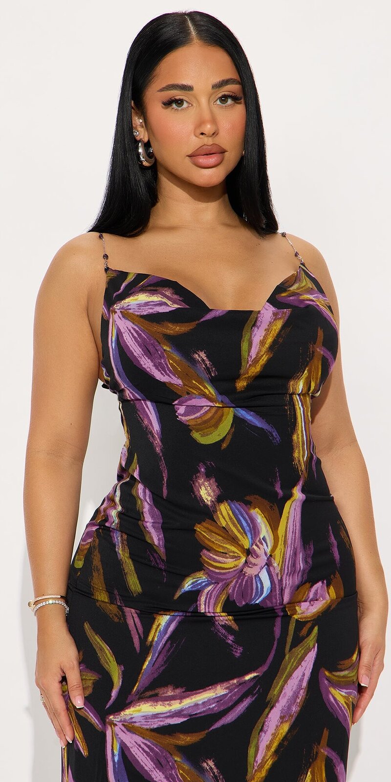 Elegantné maxi šaty v čierno-fialovej farbe očaria jemnou kvetinovou potlačou a splývavým saténovým povrchom. Hladký materiál je hebký na dotyk, luxusne sa leskne a vytvára nádherne plynulú siluetu.