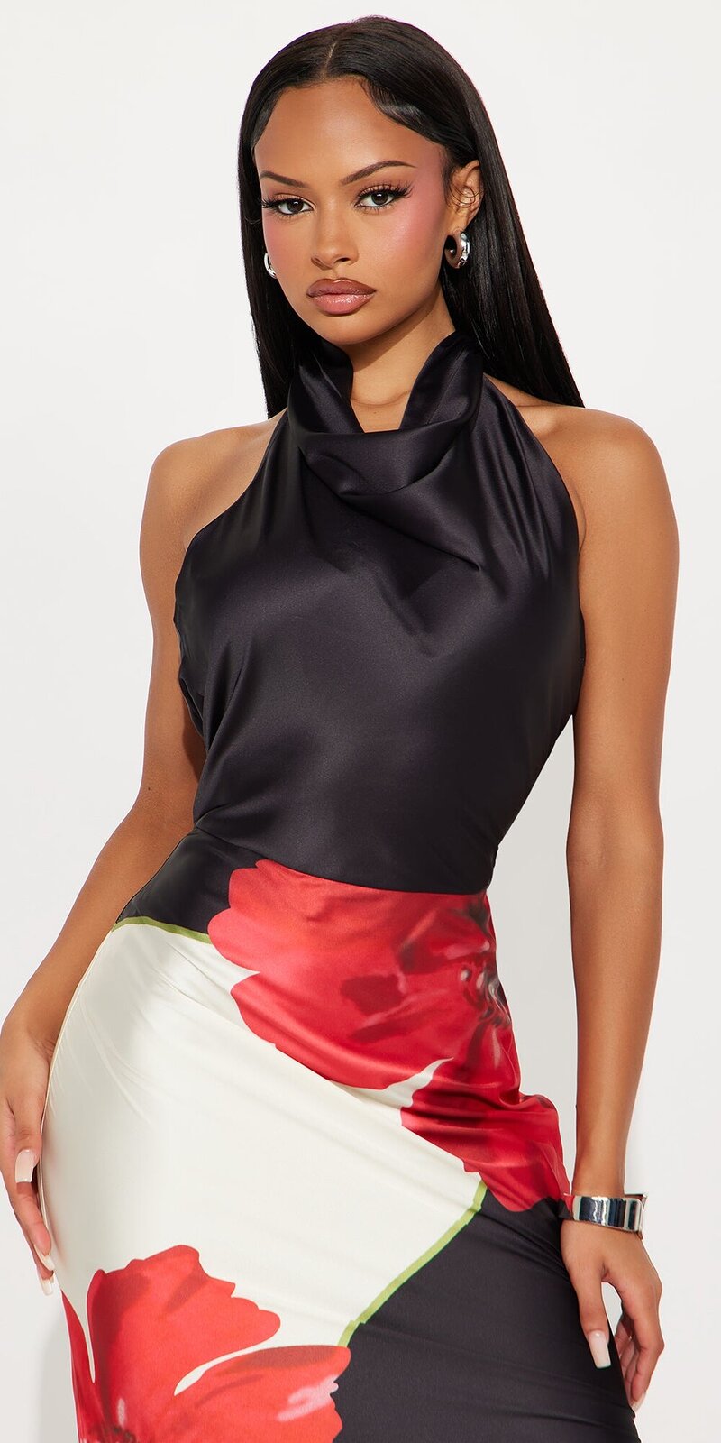Tieto saténové maxi šaty v čiernej farbe sú stelesnením večernej elegancie a sofistikovaného štýlu. Vysoký halter výstrih pôsobí noblesne a zvýrazňuje líniu ramien.
