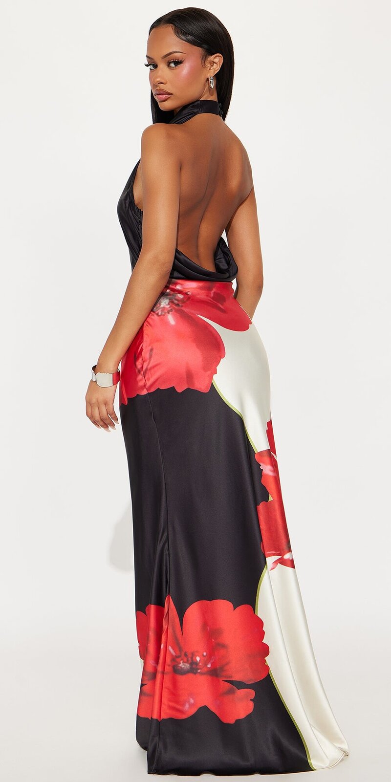 Luxusné maxi šaty v čiernej farbe zaujmú elegantným halter strihom, vysokým výstrihom a efektne odhaleným chrbtom s vodopádovým detailom. Hladký saténový materiál je jemne lesklý na dotyk, splývavý a vďaka podšívke zaisťuje komfort pri nosení.