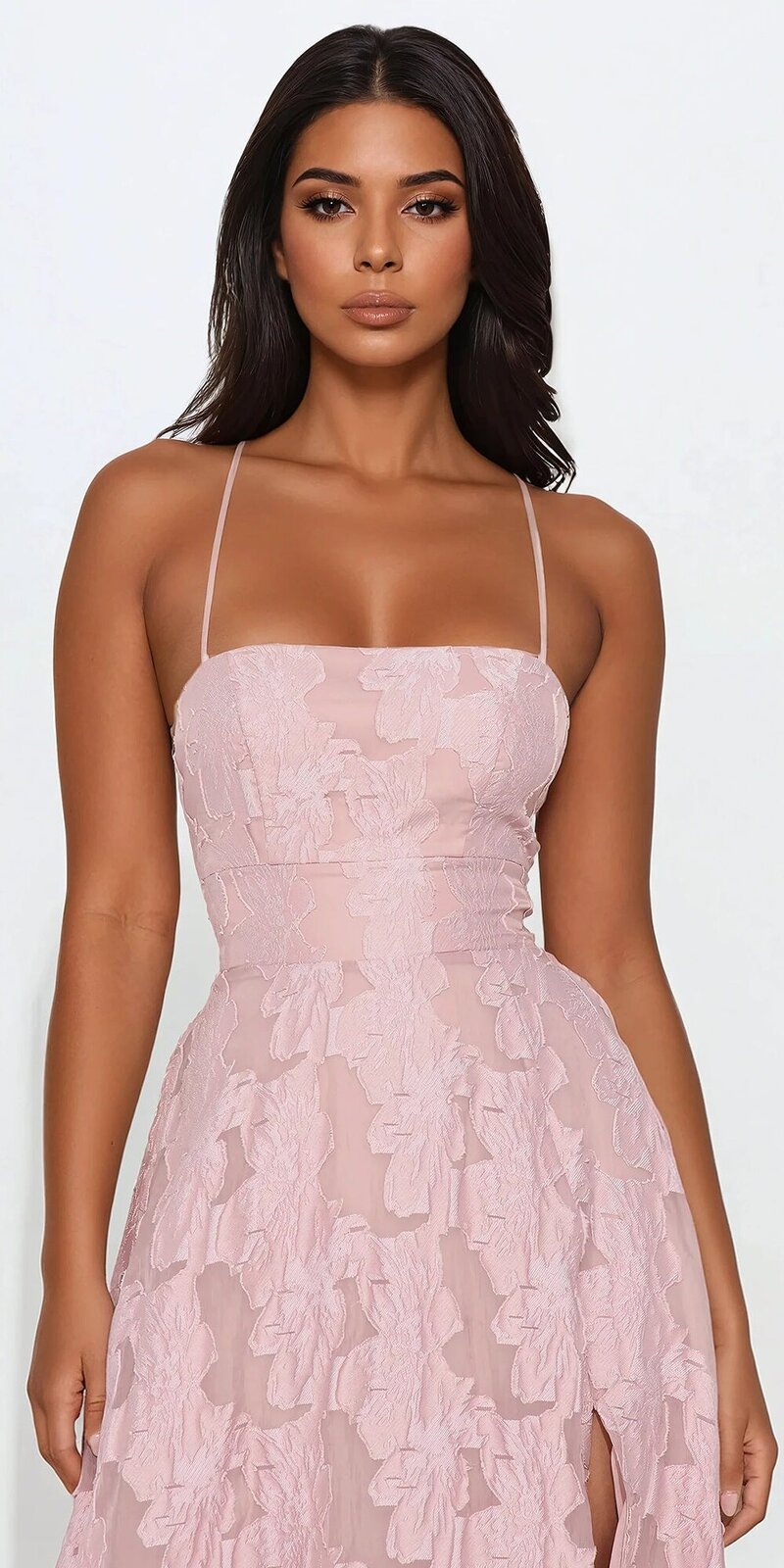 Štvorcový výstrih pôsobí sofistikovane, zatiaľ čo nastaviteľné ramienka a šnurovanie na chrbte umožňujú dokonalé prispôsobenie postave. Vysoký rozparok vpredu pridáva šatám zmyselnosť a ľahkosť.
