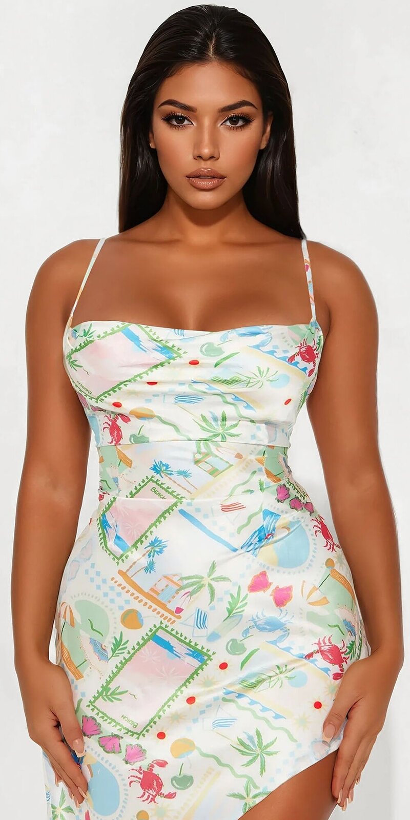 Žiarivé midi šaty s asymetrickým strihom a viacfarebnou potlačou, ideálne na leto. Ľahký materiál s hladkým povrchom sa príjemne nosí a zvýrazňuje ženskú siluetu. Nastaviteľné ramienka umožňujú dokonalé prispôsobenie.
