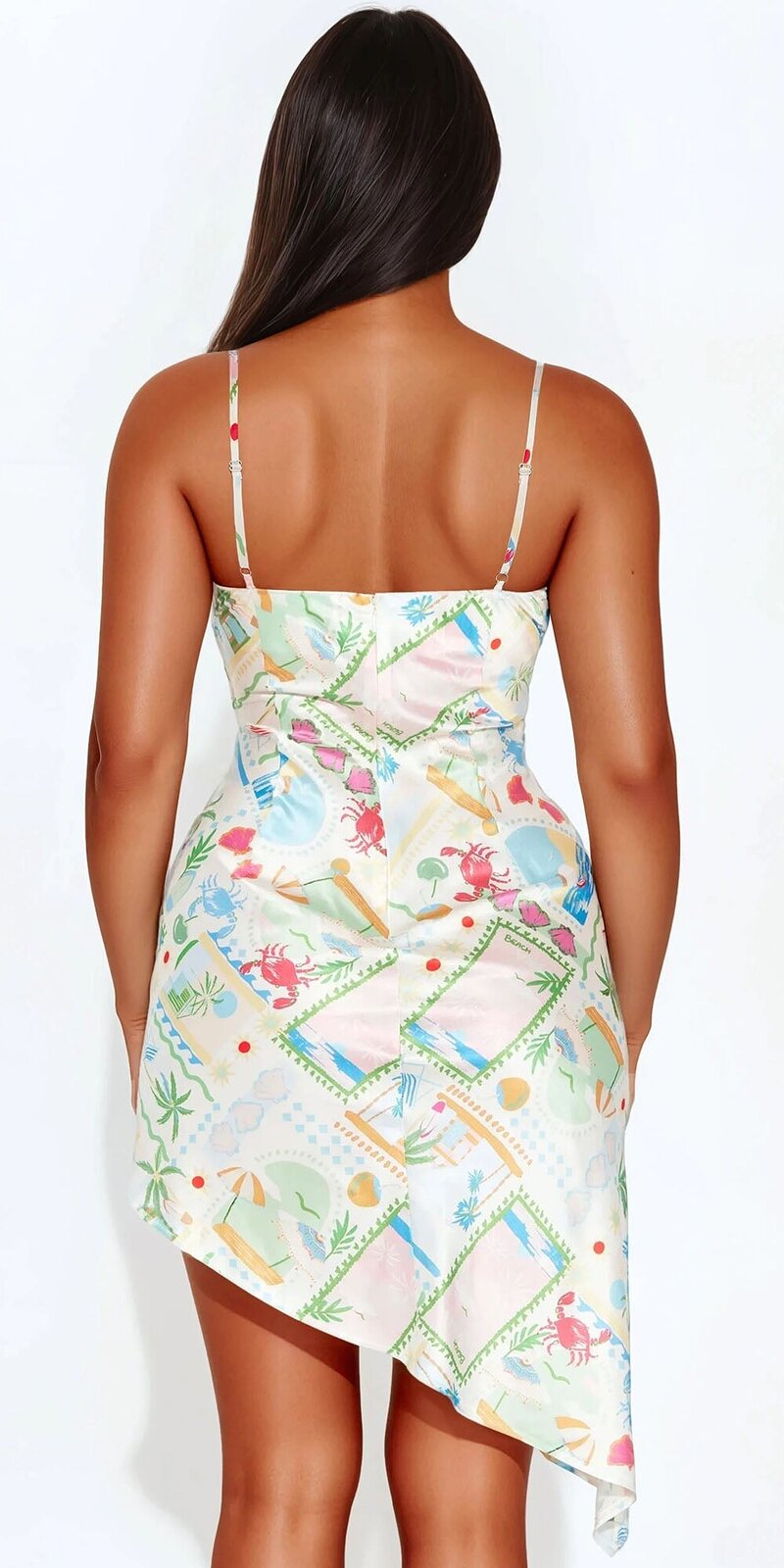 Svieža kombinácia farieb a asymetrický lem dodávajú šatám originálny charakter, ktorý zaručene zaujme. Hladká textúra látky pôsobí jemne a luxusne, čo robí z tohto kúsku ideálnu voľbu na dovolenku či letné podujatia.