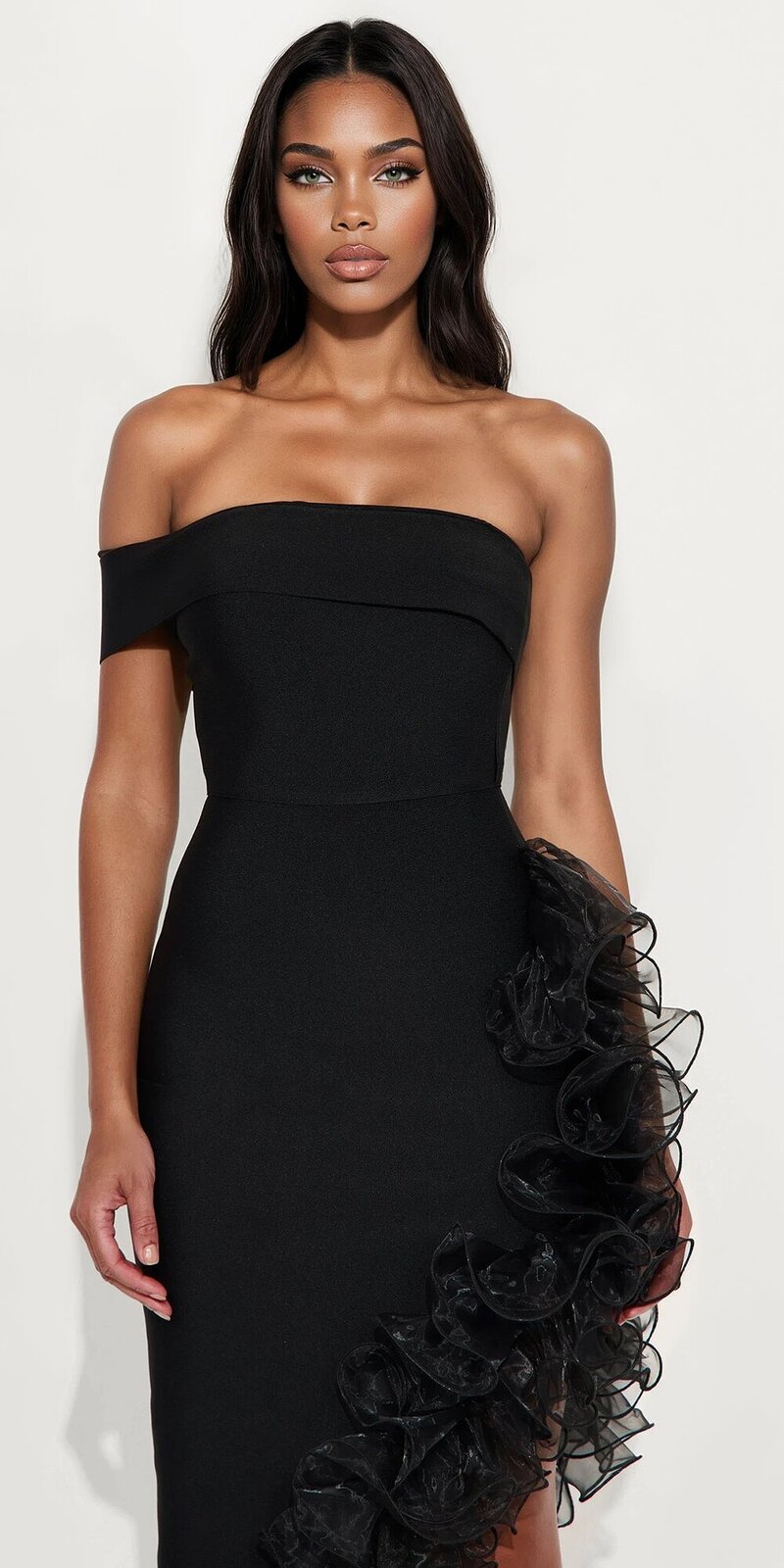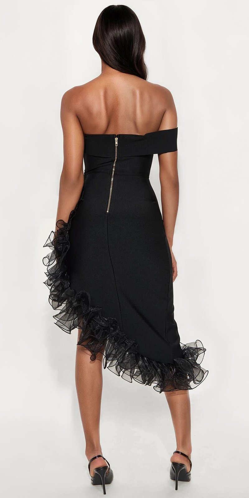 Elegantné midi šaty v čiernej farbe zaujmú asymetrickým strihom na jedno rameno a výrazným volánovým lemom. Hladký, pružný materiál je príjemný na dotyk, krásne obopína siluetu a vytvára sofistikovaný vzhľad.