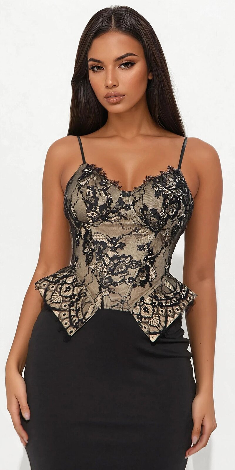 Korzetový pás s vnútornými výstužami krásne tvaruje postavu a vytvára elegantnú siluetu, zatiaľ čo véčkový výstrih a tenké ramienka zvýrazňujú dekolt s noblesnou jemnosťou. Peplum detail dodáva modelu jemný objem a dizajnový akcent.