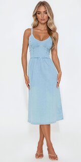 Štýlové midi šaty v modrej farbe zaujmú nadčasovým denimovým vzhľadom, véčkovým výstrihom a ženskou siluetou. Mierne pružný materiál je príjemný na dotyk, pevný a zároveň pohodlný pri nosení.