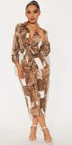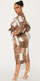 Hnedé midi šaty s denimovou potlačou a viazaním v páse