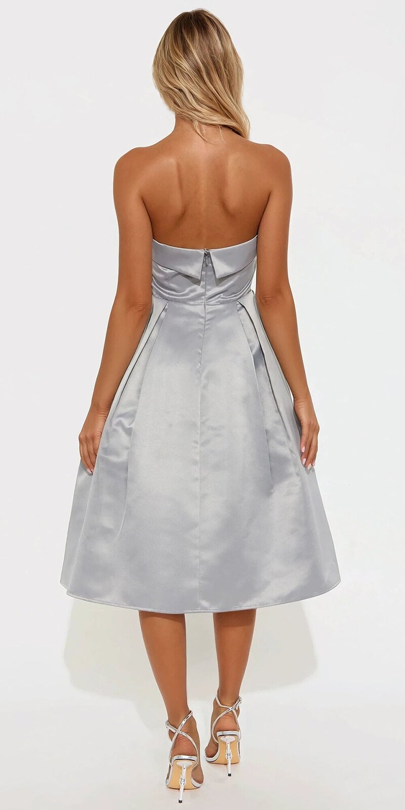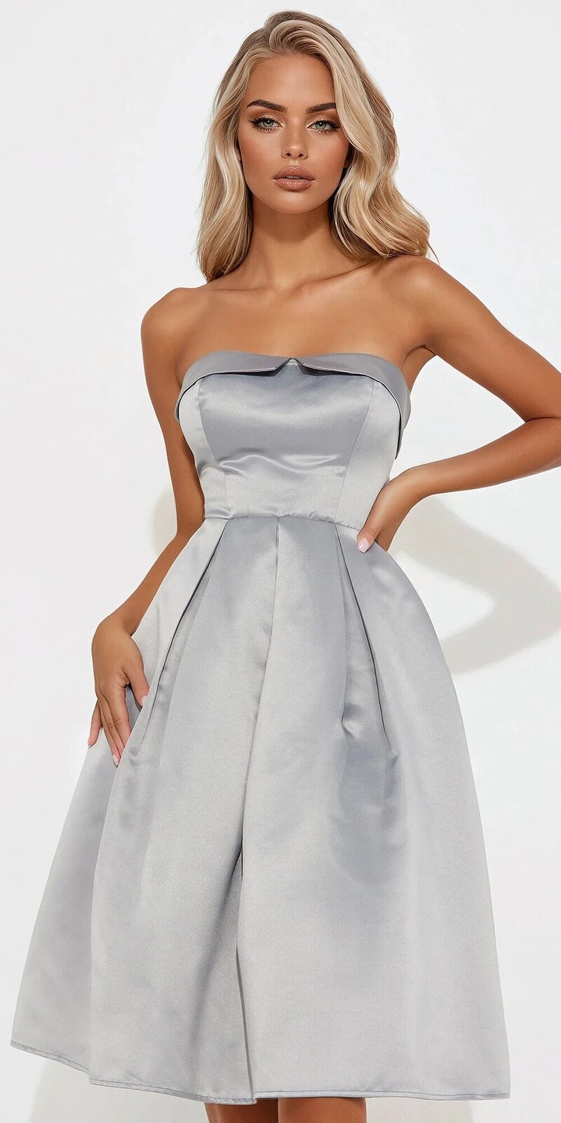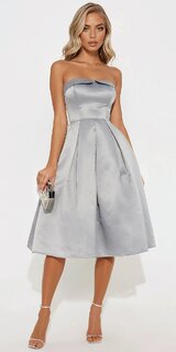 Tieto saténové midi šaty v šedozelenej farbe predstavujú nadčasovú eleganciu s moderným nádychom. Bezramienkový strih s rovnou líniou výstrihu pôsobí sofistikovane a zvýrazňuje ramená aj dekolt.