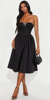 Saténové midi šaty s korzetovým pásom a mašľou v čiernej farbe