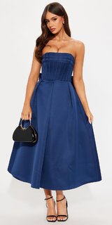 Elegantné midi šaty v modrej farbe očaria hladkým saténovým leskom, bezramienkovým strihom a korzetovým pásom s vystužením. Luxusný materiál je príjemný na dotyk, pevne drží tvar a vďaka podšívke poskytuje komfort pri nosení.