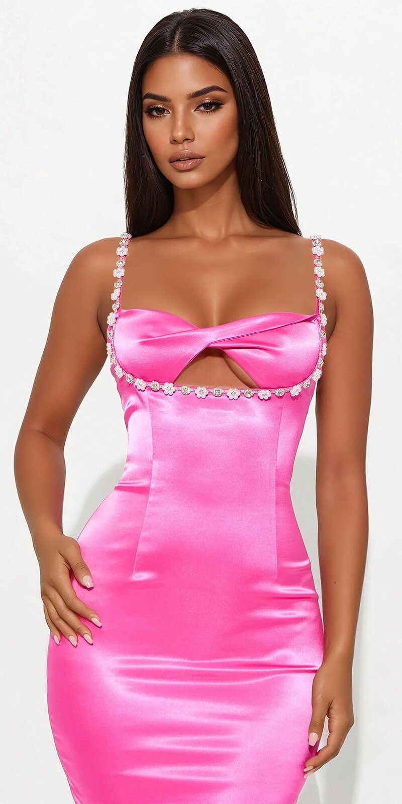Výrazné midi šaty v sýtej ružovej farbe s luxusným saténovým leskom, ktoré pôsobia hladko, splývavo a zmyselne na dotyk. Srdiečkový výstrih, trblietavé kamienky a efektný uzlový detail s výrezom vytvárajú elegantnú, no zároveň odvážnu siluetu.