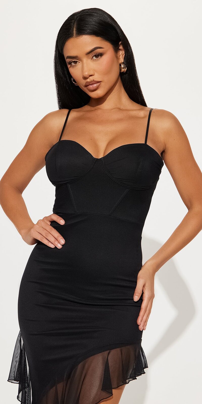 Asymetrický volánový lem dodáva šatám dynamiku a pohyb, zatiaľ čo pružný materiál sa pohodlne prispôsobí postave. Podšívka zabezpečuje komfort a istotu pri nosení.
