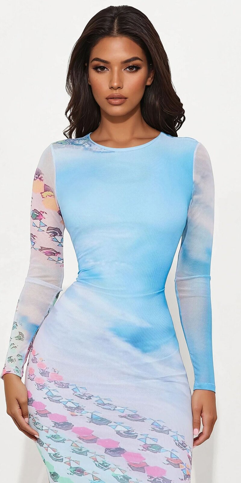 Tieto sieťované midi šaty s viacfarebným vzorom sú dokonalým spojením moderného dizajnu a elegantnej siluety. Jemne priesvitný efekt dodáva modelu zmyselný nádych, zatiaľ čo vysoký výstrih pôsobí sofistikovane a vyvážene.