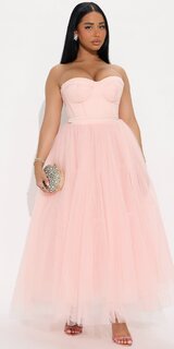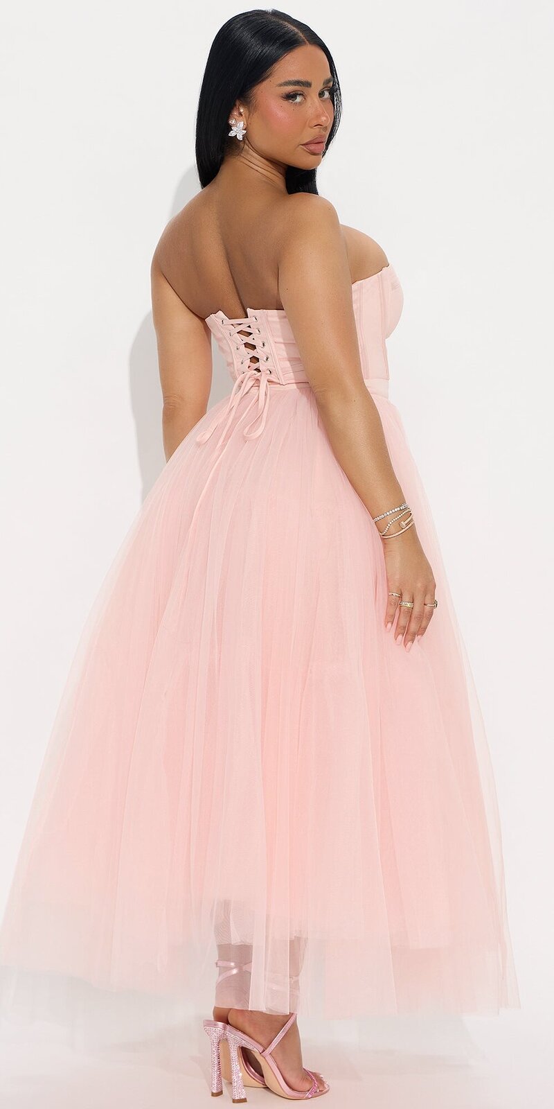 Romantické midi šaty v ružovej farbe očaria jemnou tylovou vrstvou a korzetovým pásom, ktorý krásne zvýrazňuje siluetu. Vzdušný tyl pôsobí ľahko, jemne a v kombinácii s hladkou podšívkou vytvára luxusný, hebký efekt na dotyk.