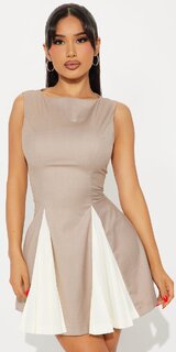 Elegantné mini šaty v béžovej farbe s jemným plisovaním a lodičkovým výstrihom pôsobia nadčasovo a sofistikovane. Bez rukávov, so skrytým zapínaním na zips vzadu a podšívkou pre maximálne pohodlie.