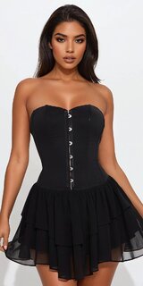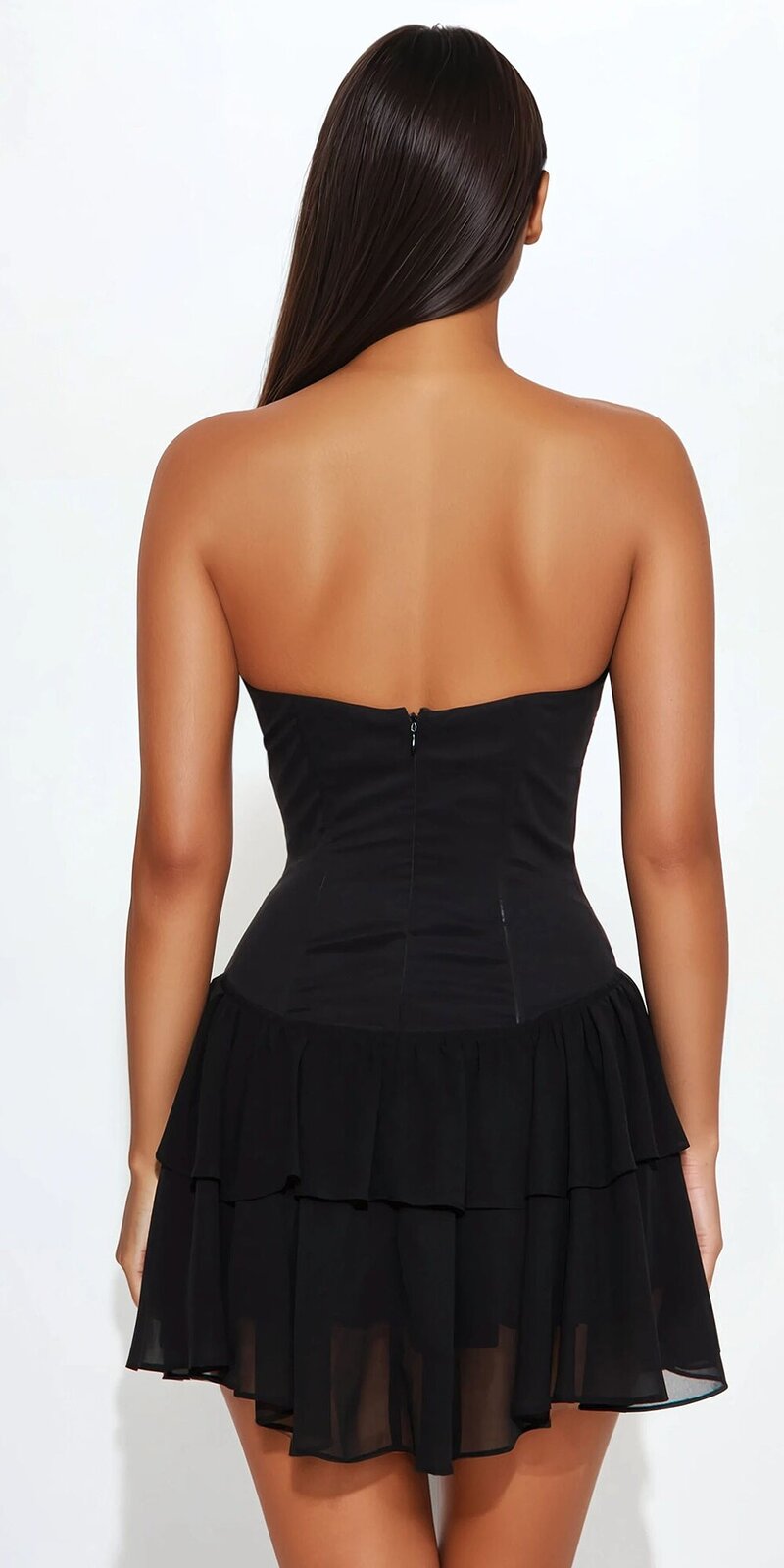 Zvodné čierne mini šaty s korzetovým živôtikom a tvarujúcou výstužou. Bez ramienok, so srdiečkovým výstrihom a volánovým lemom pre romantický vzhľad. Pružný materiál s podšívkou zaručuje komfort a dokonalé padnutie.