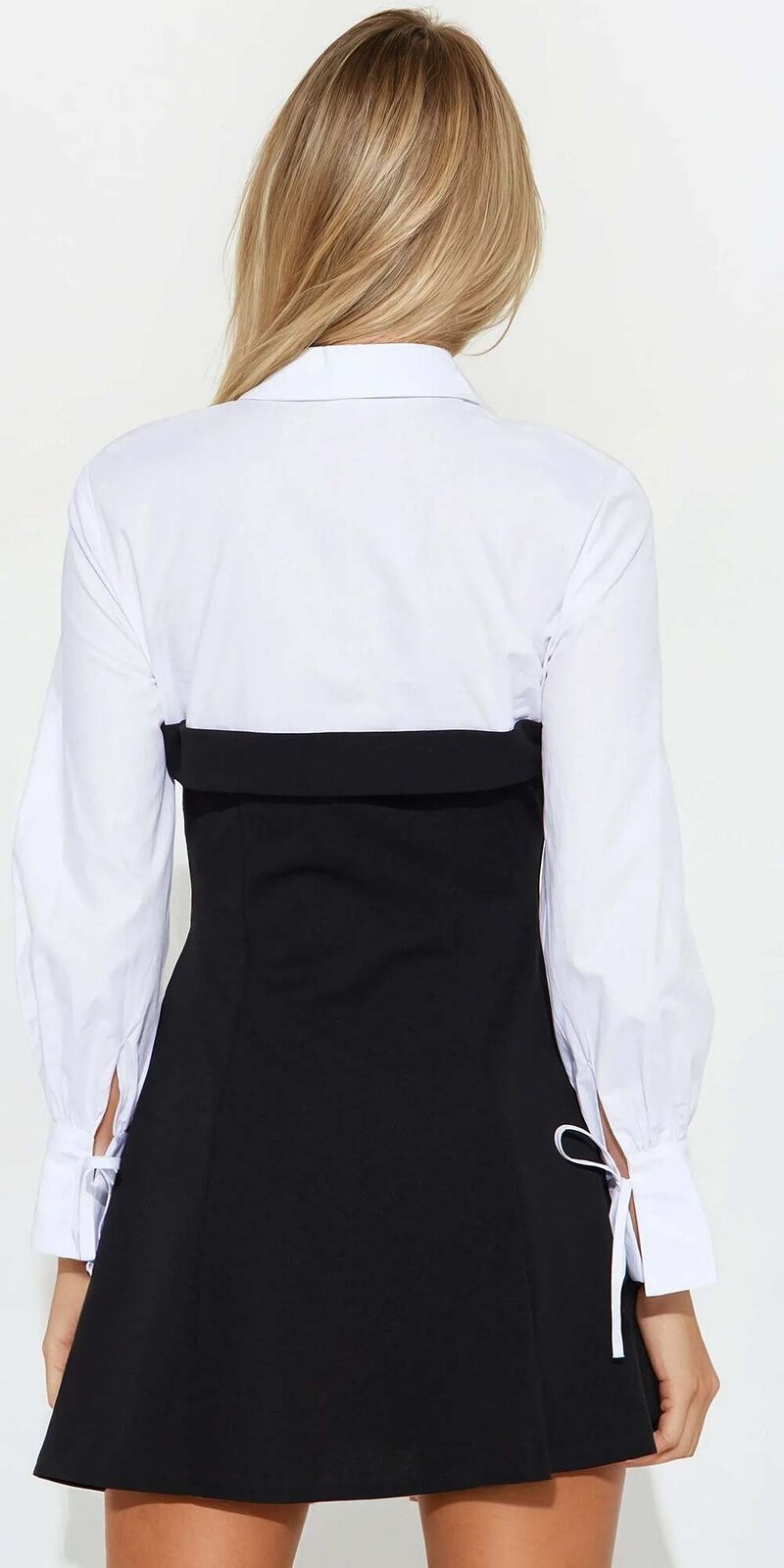 Trendy čierne mini šaty košeľového strihu so zapínaním na gombíky a jemne rozšírenými rukávmi s viazaním. Elastický materiál v kombinácii s bavlnenými detailmi zabezpečuje pohodlie a elegantný vzhľad.
