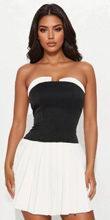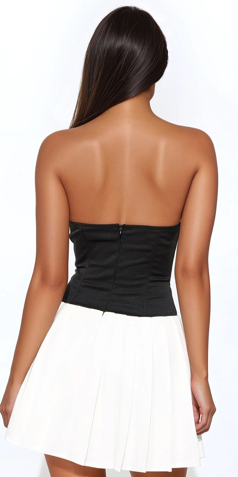 Tieto čierne plisované mini šaty s kontrastným lemom sú stelesnením parížskej elegancie. Bezramienkový strih s rovným výstrihom decentne zvýrazňuje ramená, zatiaľ čo korzetový pás s výstužou nádherne formuje siluetu a dodáva šatám luxusný charakter.