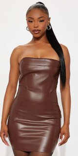 Tieto hnedé mini šaty bez ramienok z imitácie kože sú stelesnením odvážneho a moderného štýlu. Ich krátky strih zvýrazňuje nohy, zatiaľ čo lesklý povrch dodáva modelu sofistikovaný a exkluzívny charakter.