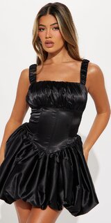 Luxusné mini šaty v čiernej farbe z jemného saténu, ktoré očaria hladkým, jemne lesklým povrchom a výraznou balónovou sukňou. Korzetový pás s vystužením krásne tvaruje postavu a spolu so šnurovaním na chrbte vytvára elegantnú, ženskú siluetu.