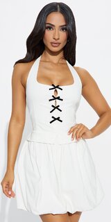 Výrazné mini šaty očaria jemne hravým dizajnom s balónovou sukňou a elegantným halter výstrihom. Hladký, jemne pružný materiál je príjemný na dotyk, krásne drží tvar a pôsobí luxusne pri každom pohybe.