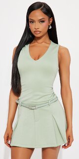 Elegantné mini šaty v zelenej farbe zaujmú hlbokým véčkovým výstrihom, jemným plisovaním a štýlovým opaskom v páse. Hladký, pružný materiál je príjemný na dotyk, krásne sa prispôsobí siluete a vďaka podšívke poskytuje komfort pri nosení.