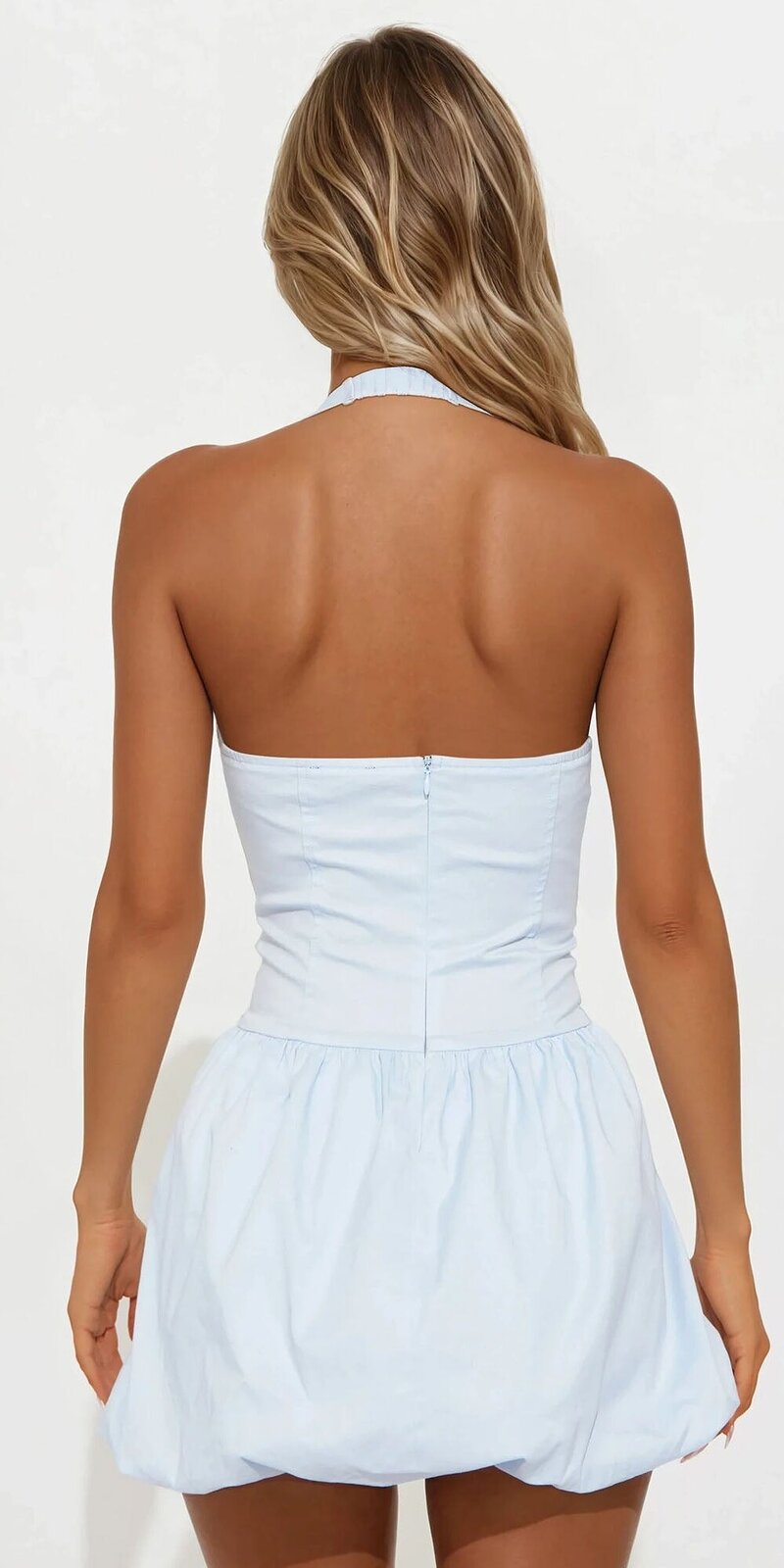 Tieto mini šaty v modrej farbe prinášajú svieži a trendový dizajn s dôrazom na výraznú siluetu. Balónový lem dodáva modelu objem a hravosť, vďaka čomu šaty pôsobia moderne a neprehliadnuteľne.