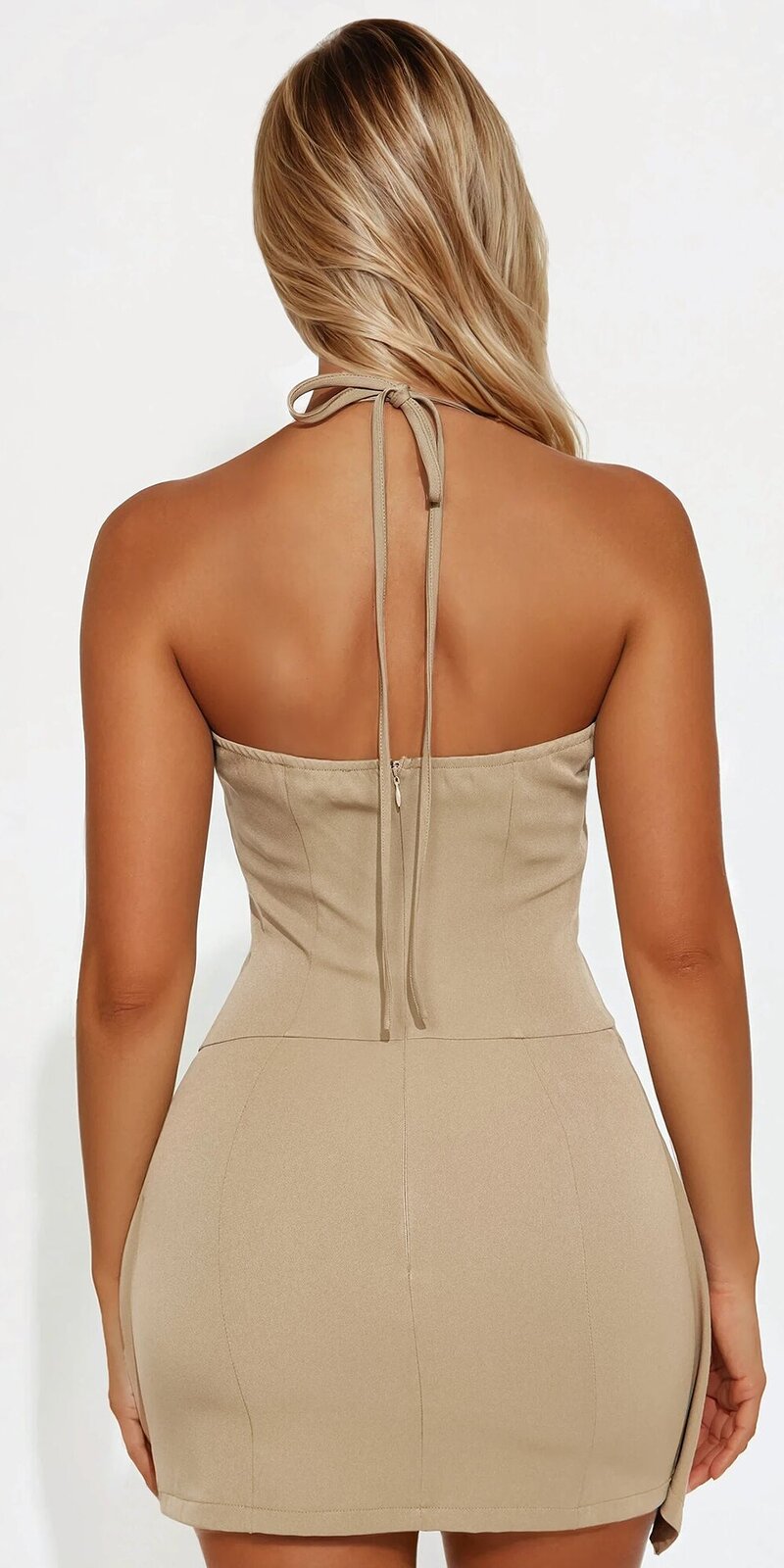 Tieto mini šaty v béžovej farbe sú navrhnuté pre ženy, ktoré chcú zaujať sebavedomým a moderným štýlom. Minimalistický dizajn v kombinácii s precízne tvarovanou siluetou vytvára luxusný a výrazný dojem.