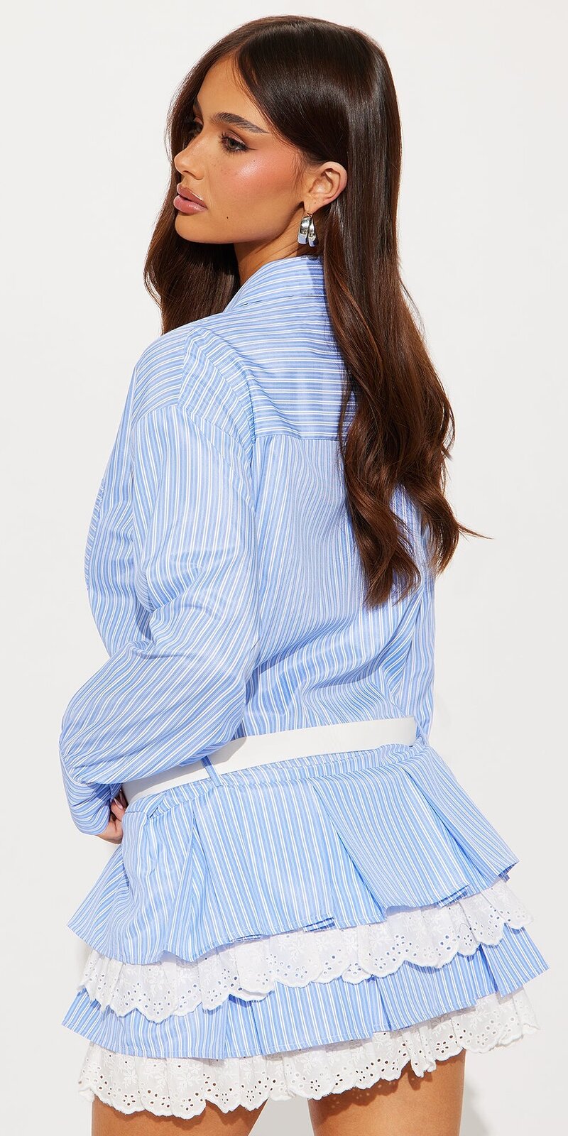 Tieto pruhované košeľové mini šaty v modrej farbe predstavujú modernú kombináciu elegantného a romantického štýlu. Košeľový strih s golierom a gombíkovým zapínaním dodáva modelu sofistikovaný charakter.