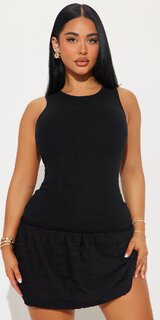 Štýlové mini šaty v čiernej farbe zaujmú priliehavým rebrovaným dizajnom, ktorý elegantne kopíruje postavu. Jemne pružný, mäkký materiál je príjemný na dotyk a kontrastná volánová sukňa dodáva modelu hravý, no zároveň luxusný vzhľad.