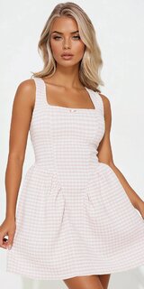 Tieto rozkošné mini šaty v svetloružovej farbe sú stelesnením romantického letného štýlu. Jemný kockovaný vzor im dodáva hravý charakter, zatiaľ čo štvorcový výstrih a kvetinový detail na prednej strane vytvárajú ženský, elegantný vzhľad.