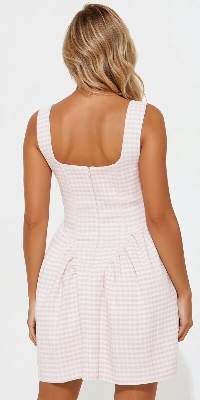 Romantické mini šaty s jemným kockovaným vzorom v svetloružovej farbe pôsobia nežne a sviežo. Majú štvorcový výstrih, kvetinový detail na hrudi a pohodlný elastický materiál. Zapínanie na zips vzadu zabezpečí dokonalé prispôsobenie postave.