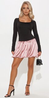 Zvodné čierno-ružové mikro šaty zo saténu s dlhými rukávmi a štvorcovým výstrihom. Bublinkový lem dodáva objem a hravosť, zatiaľ čo pružný materiál zvýrazňuje ženské krivky. Podšívka zaručuje pohodlie a luxusný vzhľad.