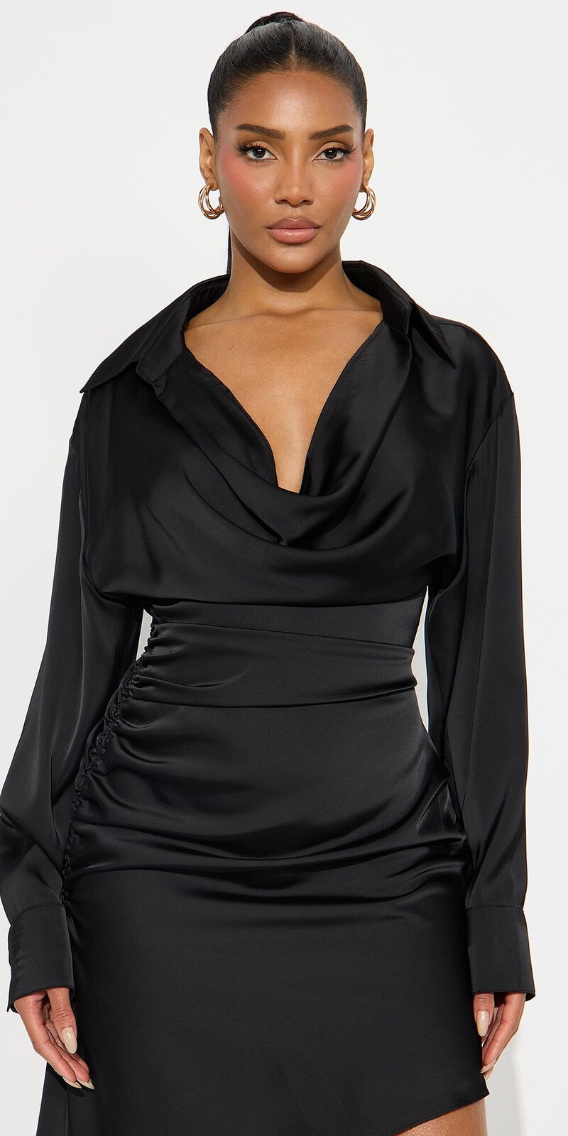 Elegantné mini šaty v čiernej farbe spájajú košeľový štýl s luxusným saténovým povrchom. Hladký satén je jemne lesklý, hebký na dotyk a vďaka podšívke pôsobí komfortne a upravene.