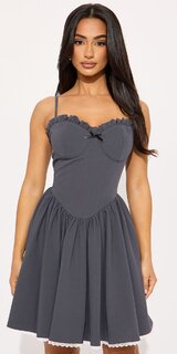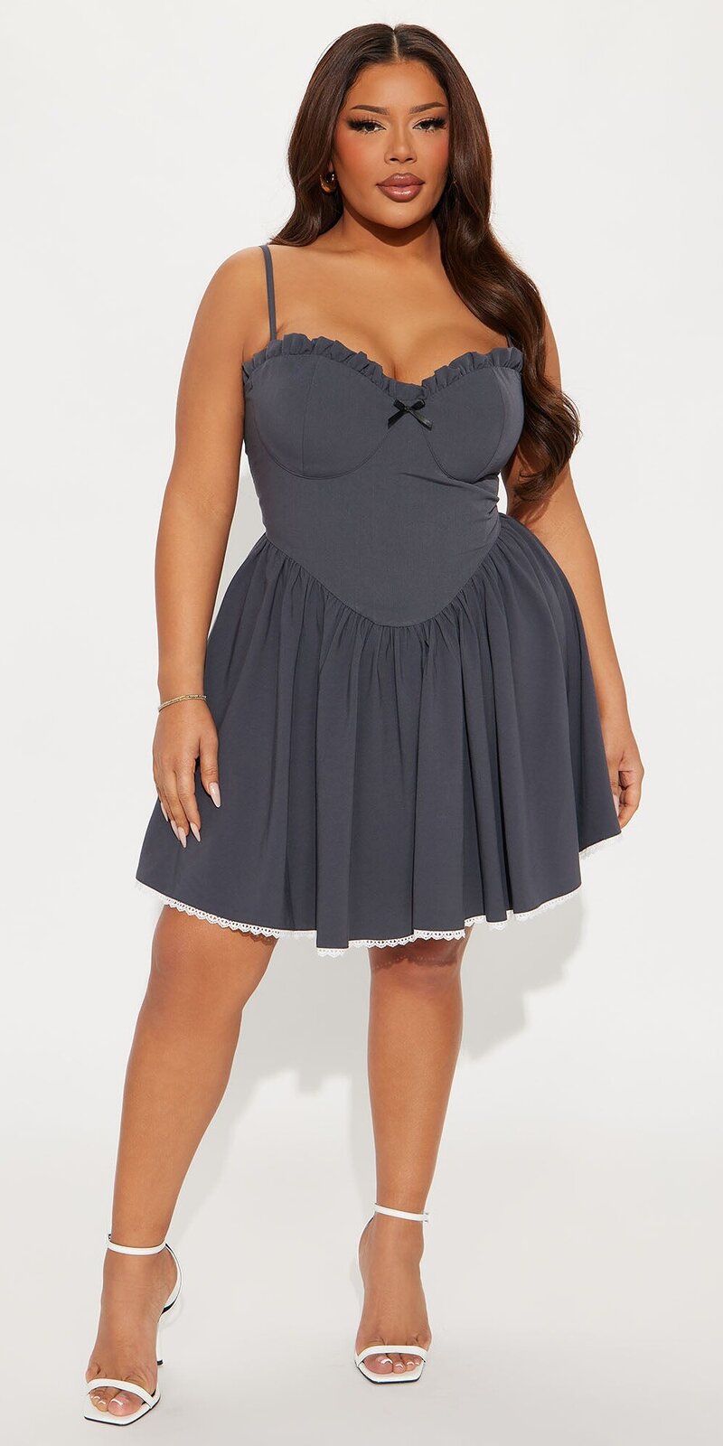 Romantické mini šaty v tmavosivej farbe s jemným leskom majú srdiečkový výstrih, korzetový dekolt s výstužou a decentnú mašľu vpredu. Nastaviteľné ramienka a jemné volániky dodávajú šatám dievčenský šarm.