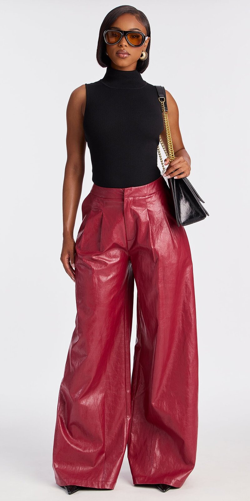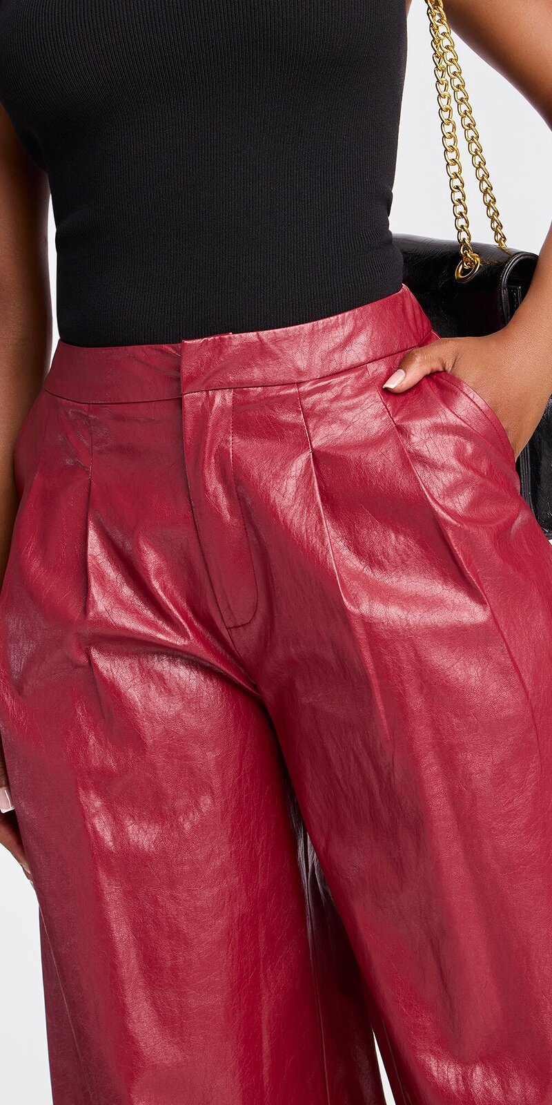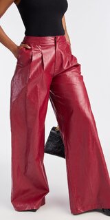 Výrazné nohavice v červenej farbe zaujmú moderným širokým strihom a hladkým povrchom s koženým efektom. Pevnejší materiál je hladký na dotyk, drží tvar a vytvára sebavedomú siluetu.