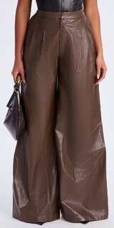 Elegantné nohavice v hnedej farbe zaujmú moderným širokým strihom a hladkým povrchom s koženým efektom. Pevnejší materiál je hladký na dotyk, drží tvar a vytvára sebavedomú siluetu.