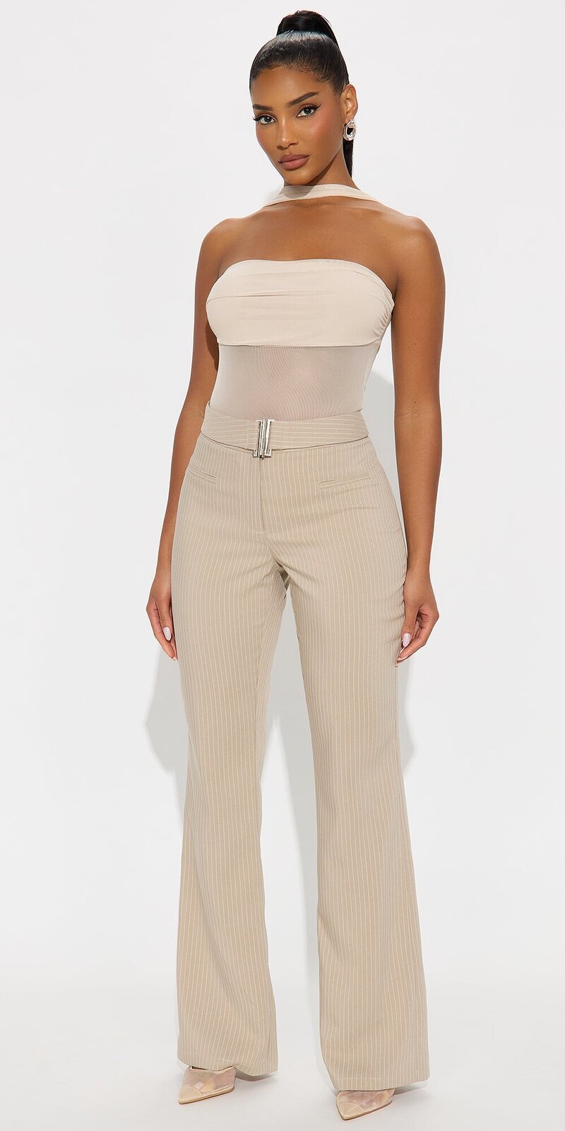 Nižší pás doplnený o štýlový opasok dodáva modelu výrazný módny akcent, zatiaľ čo jemný prúžkovaný vzor podčiarkuje luxusný charakter nohavíc. Zapínanie na gombík a zips zachováva čistý a uhladený vzhľad.