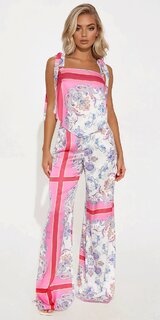 Luxusná saténová súprava v ružovo-vzorovanom prevedení pozostávajúca z bezrukávového topu a dlhých nohavíc s rovnými nohavicami. Ľahký, lesklý materiál pôsobí elegantne a vzdušne. Zapínanie vpredu na zips a praktické vrecká.