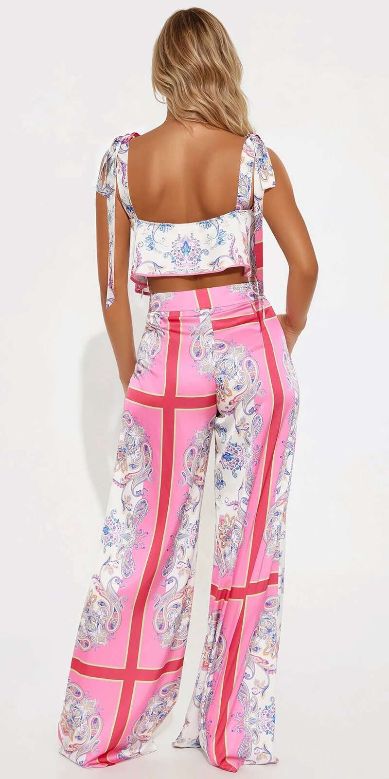 Ružovo-vzorovaná saténová súprava s topom a nohavicami