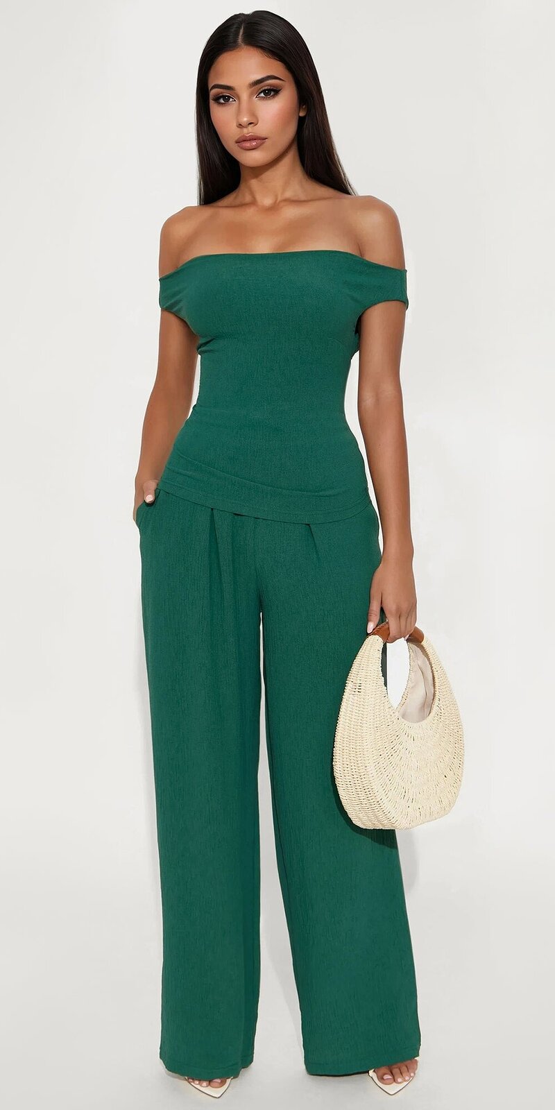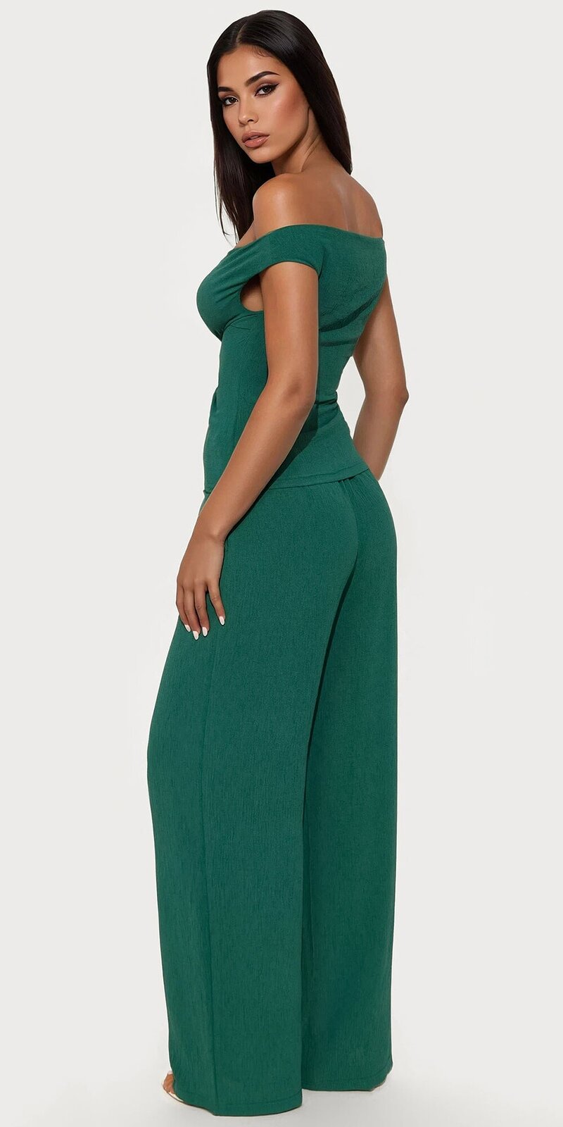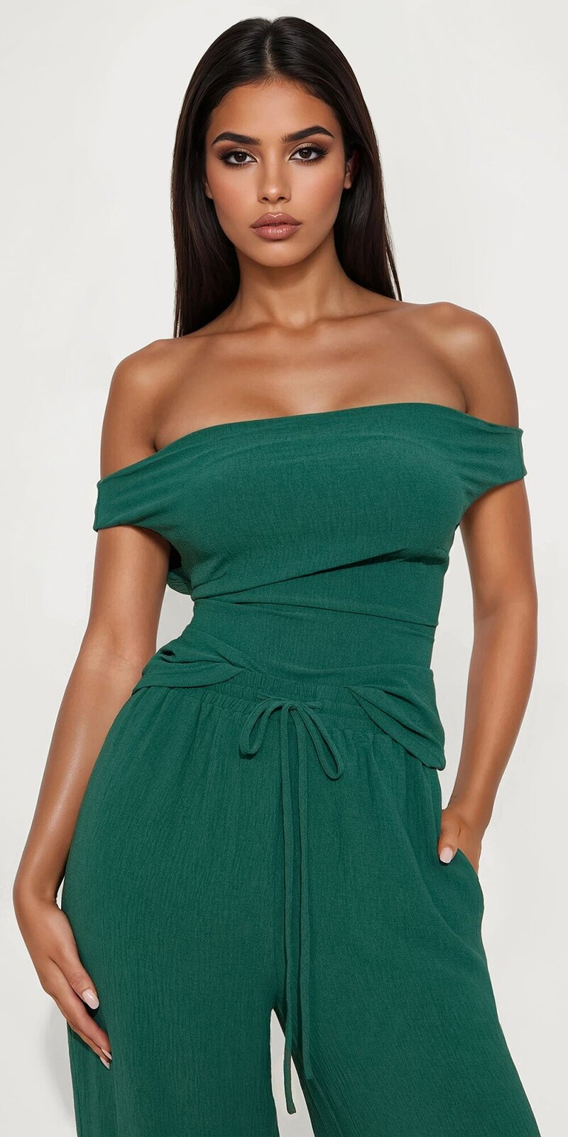 Táto zelená dvojdielna súprava s odhalenými ramenami predstavuje elegantný a zároveň pohodlný outfit pre každú modernú ženu. Ľahký splývavý materiál sa prispôsobí pohybu a vďaka jemnému lesku pôsobí luxusne.