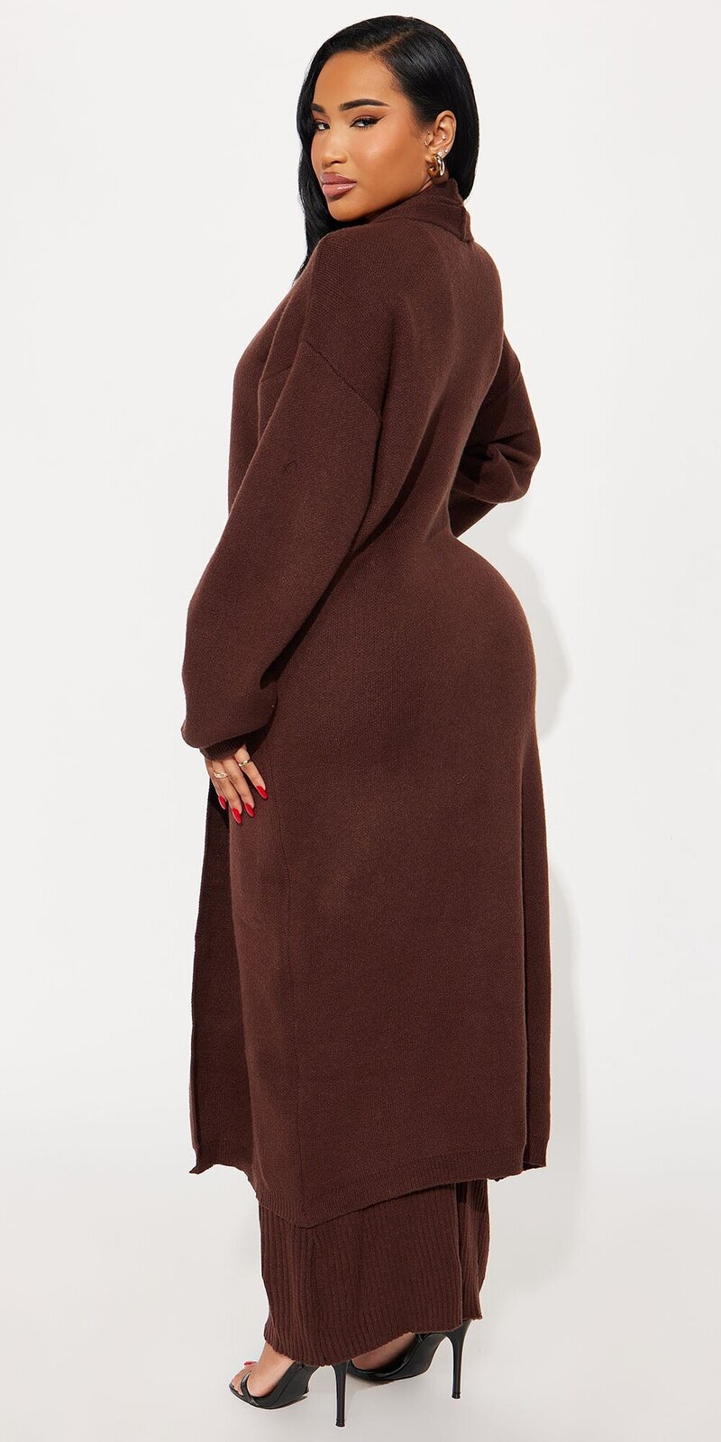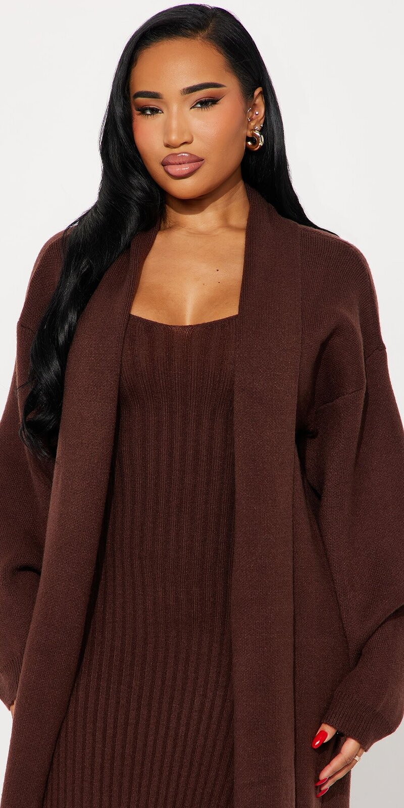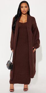 Súprava Local Love ponúka rafinované spojenie komfortu a ženského štýlu. Hnedé maxi šaty bez rukávov krásne zvýrazňujú siluetu, zatiaľ čo dlhý kardigán ju zahaľuje do jemného a hrejivého úpletu.