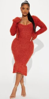 Hrdzavé úpletové maxi šaty s bolerom a volánovým lemom