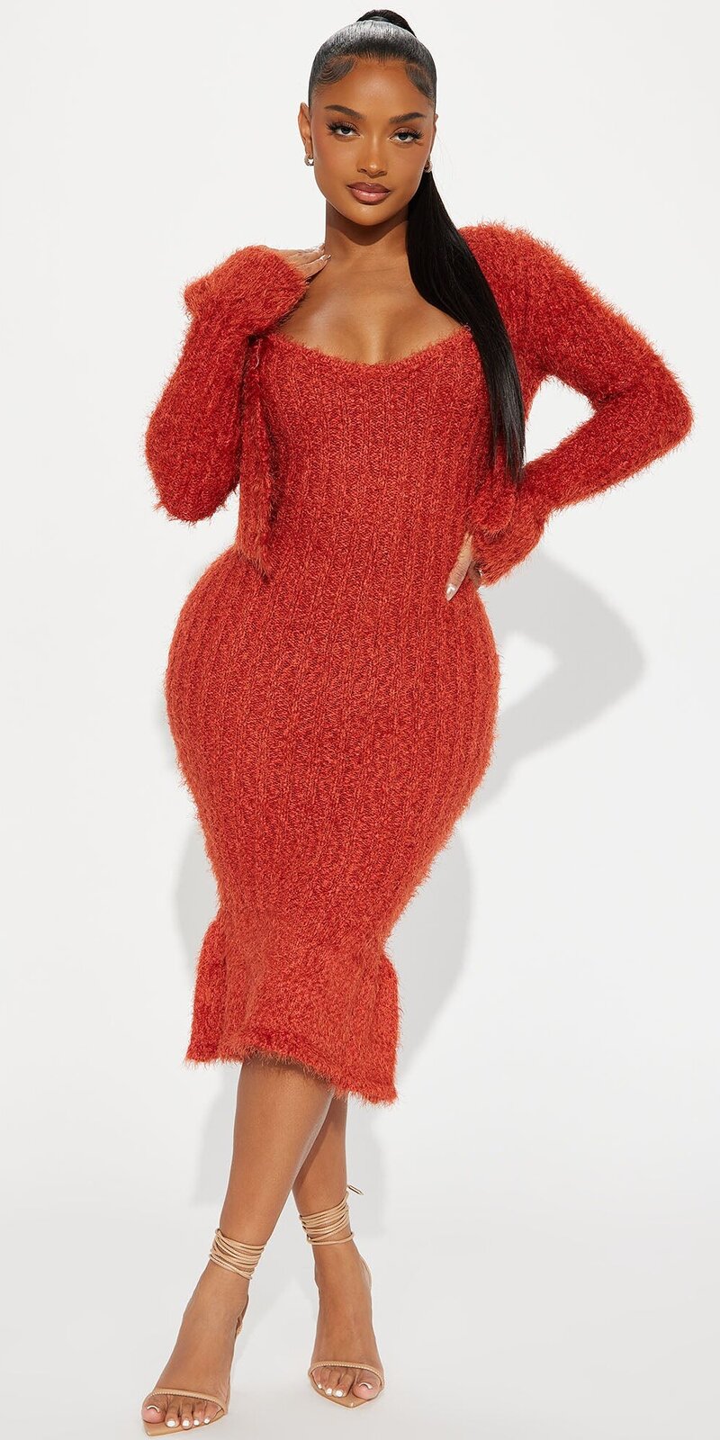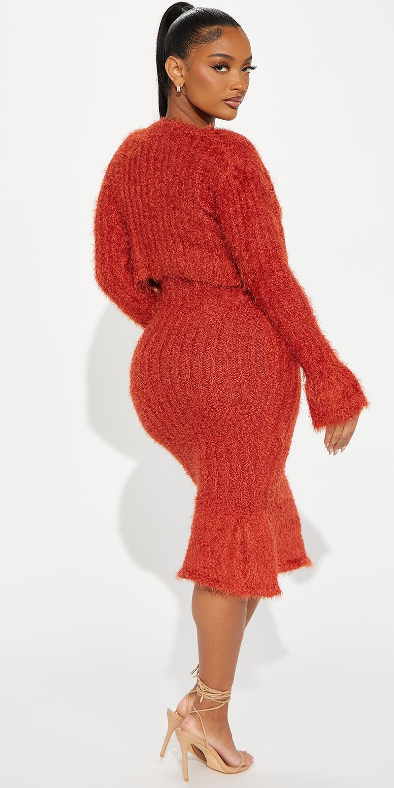 Tento hrdzavý úpletový set spája ženskosť, pohodlie a eleganciu v jednom. Dlhé maxi šaty s tenkými ramienkami a jemným výstrihom do V nádherne zvýraznia siluetu, zatiaľ čo volánový lem dodáva modelu romantický pohyb pri každom kroku.