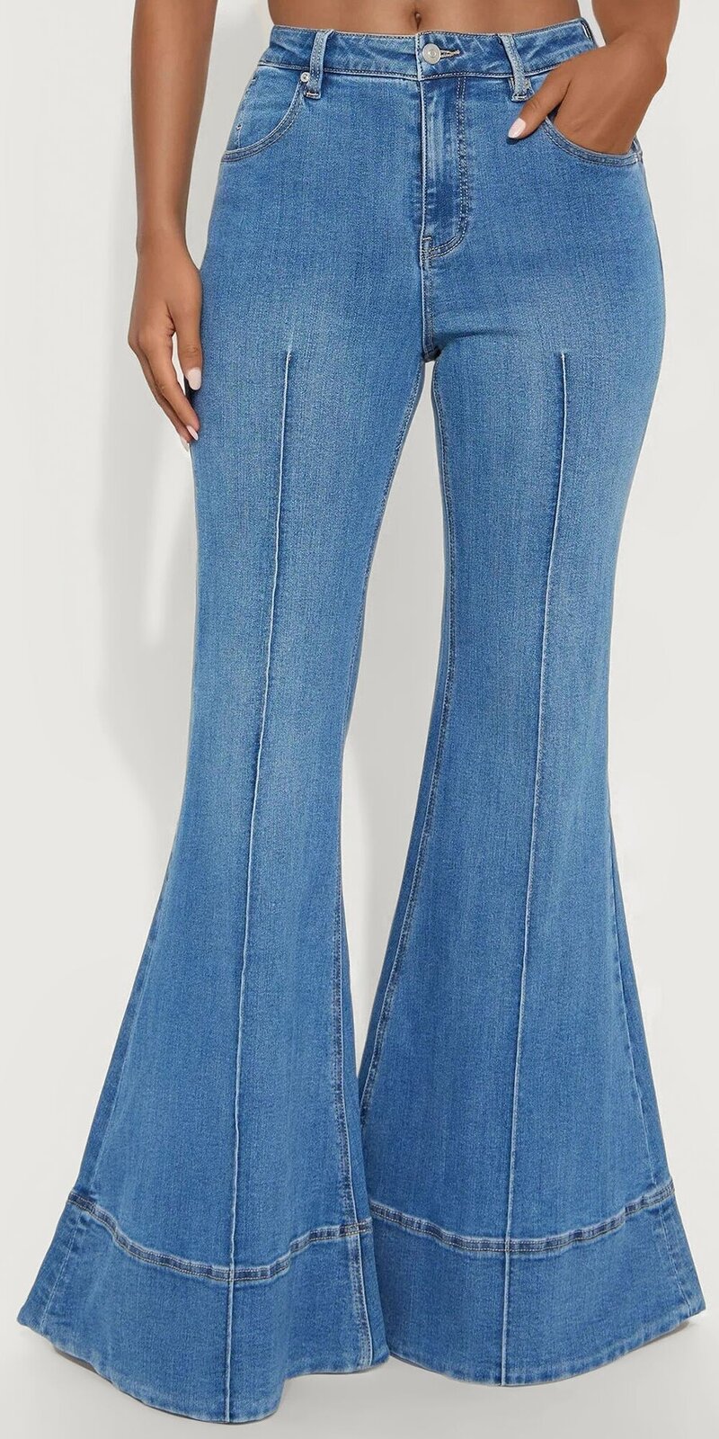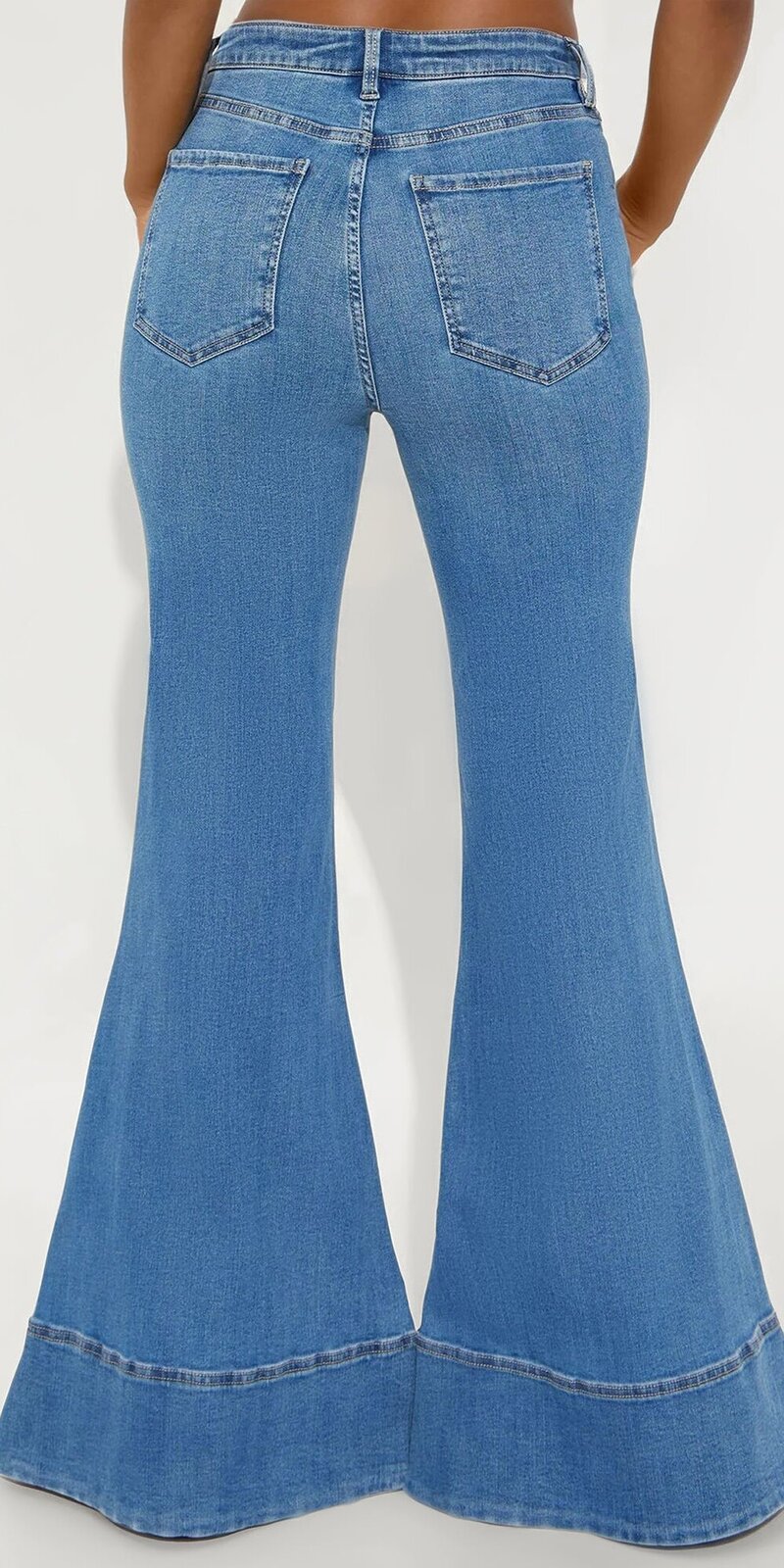 Štýlové džínsy s extrémnym flare strihom v strednom wash odtieni kombinujú retro siluetu s moderným pohodlím. Výrazne rozšírené nohavice opticky predlžujú nohy a dodávajú outfitu osobitý charakter.